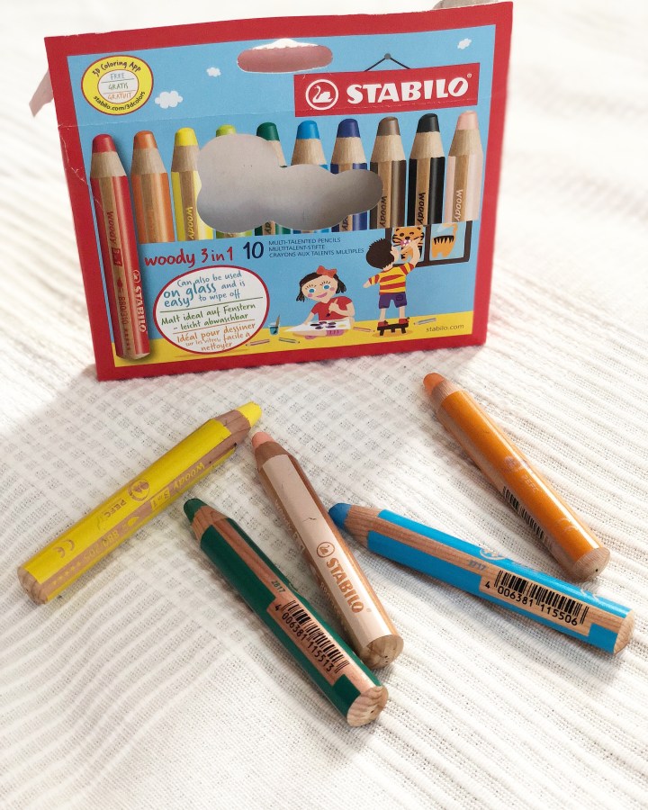Falls es doch mal die richtigen Stifte sein sollen, haben wir uns die Stabilo Woody 3 in 1 Stifte gekauft. Die sind quasi Buntstift, Wasserfarbe und Wachsmalkreide in einem. Findet ihr hier: Stabilo Woody Stifte